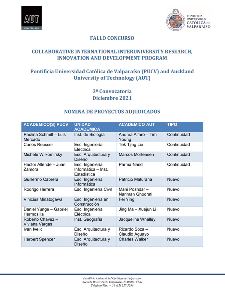 Fallo Concurso de Investigación e Innovación PUCV-AUT (New Zealand) 2020 - 2021