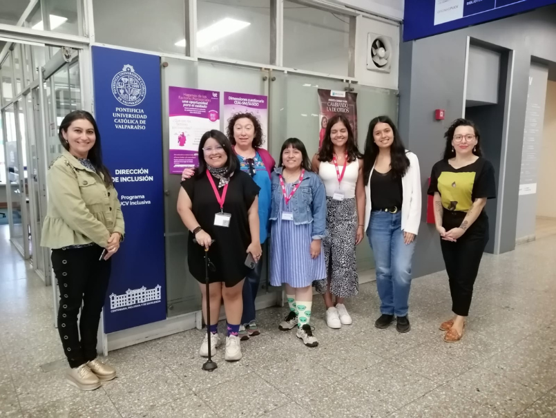 Descripción de imagen. Directora de Inclusión (s), junto a equipo de PUCV Inclusiva y de fundación Capaz, a las afueras de oficina del programa de acompañamiento de la PUCV.