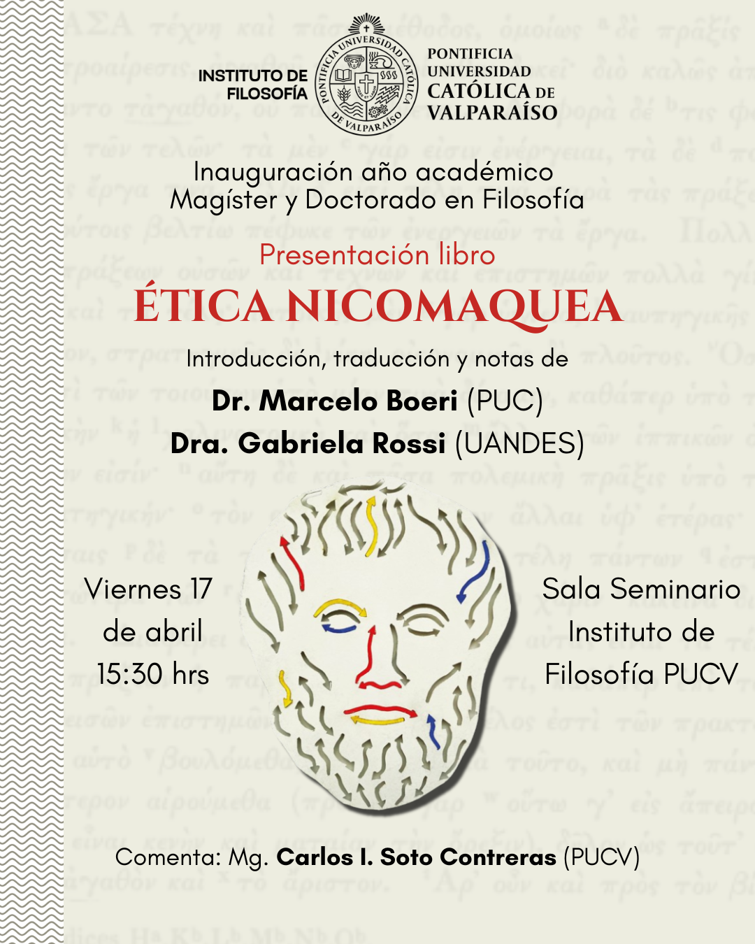 El Instituto de Filosofía PUCV tiene el agrado de invitar a toda la comunidad educativa a la inauguración del año académico 2026 de los programas de Magíster y Doctorado en Filosofía. En esta ocasión se realizará la presentación de la traducción (acompañada de una robusta introducción y de notas) de la Ética Nicomaquea (2024, PUZ) de Aristóteles a cargo de los destacados especialistas Dr. Marcelo Boeri (PUC) y la Dra. Gabriela Rossi (UANDES).