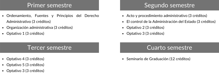 Con ello presente, el graduado del programa cuenta con diversas competencias avanzadas, puesto que conoce, comprende y analiza críticamente contenidos avanzados y actualizados en Derecho Público, con particular atención en el Derecho Administrativo; interpreta, realiza un diagnóstico y analiza críticamente problemas legales complejos vinculados en las relaciones con los órganos y servicios públicos; previene y resuelve problemas legales complejos mediante instrumentos y estrategias que incorporan o aplican los conocimientos especializados; y diseña estrategias, instrumentos de solución y análisis crítico con el objeto de resolver problemas y que se caracterizan por su rigor metodológico y exhaustividad.