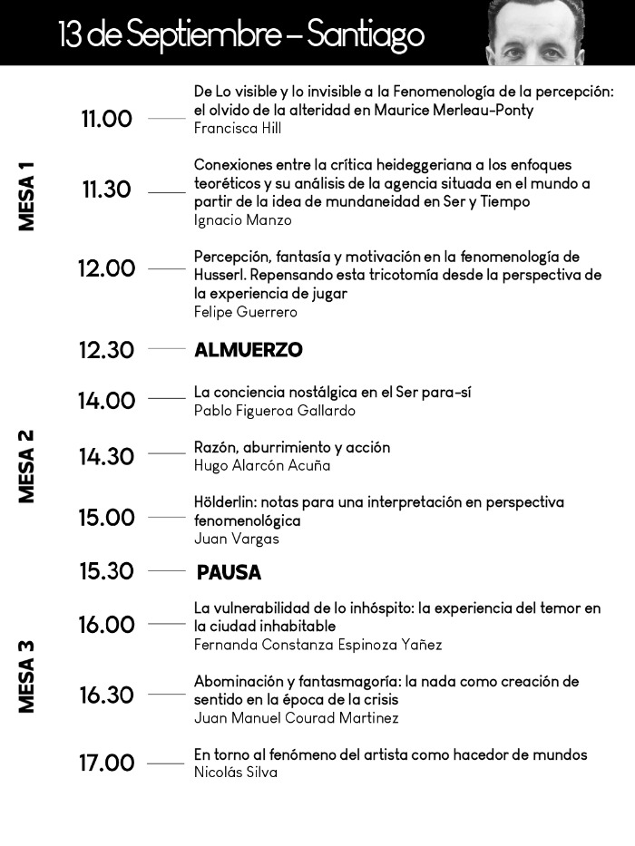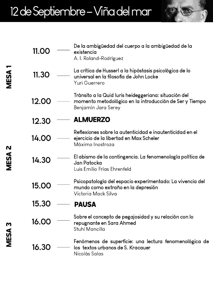 La Asociación Chilena de Fenomenología, el Instituto de Filosofía de la Pontificia Universidad Católica de Valparaíso y el Instituto de Filosofía de la Universidad Diego Portales, invitan a estudiantes de pre y posgrado a participar como asistentes en la 7° versión del Coloquio de Fenomenología para estudiantes, que se celebrará el 12 y 13 de septiembre de 2024. El coloquio tendrá lugar, el día 12 de septiembre, en la Sala Redes, localizada en la Biblioteca de la Facultad de Filosofía y Educación de la Pontificia Universidad Católica de Valparaíso y, el día 13 de septiembre, en las dependencias de la Universidad Diego Portales (Santiago), en el Auditorio de Av. Ejército 278.