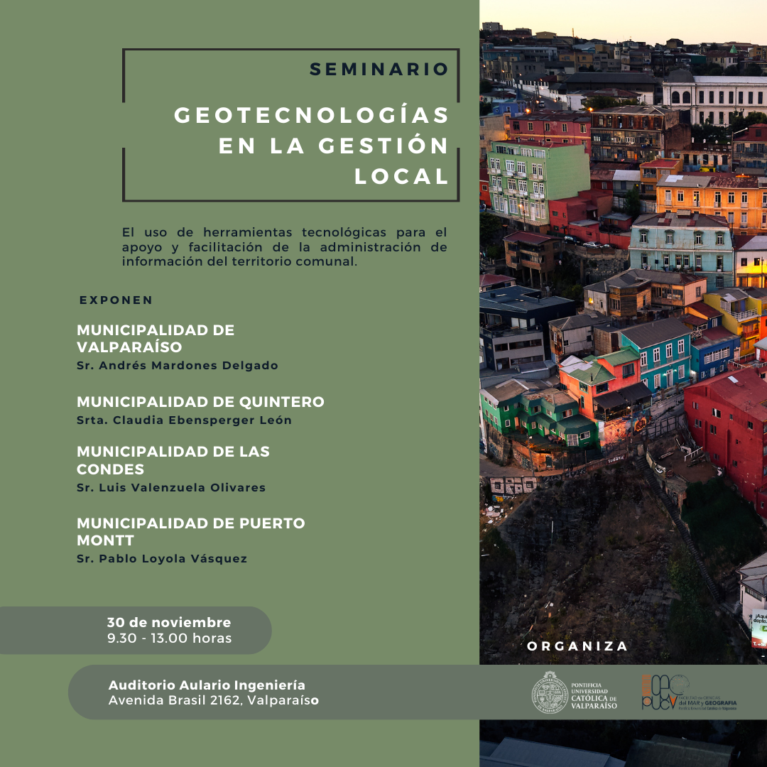 El jueves 30 de noviembre se realizará en la ciudad de Valparaíso el Seminario “Geotecnologías en la gestión local”, el cual es organizado por el Instituto de Geografía PUCV.
