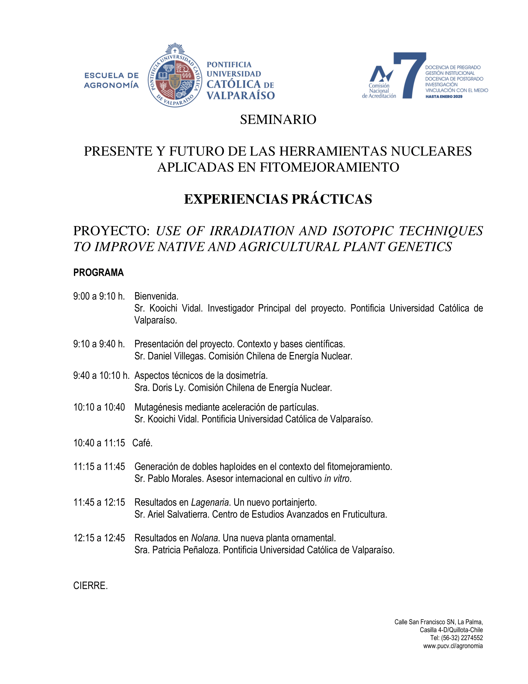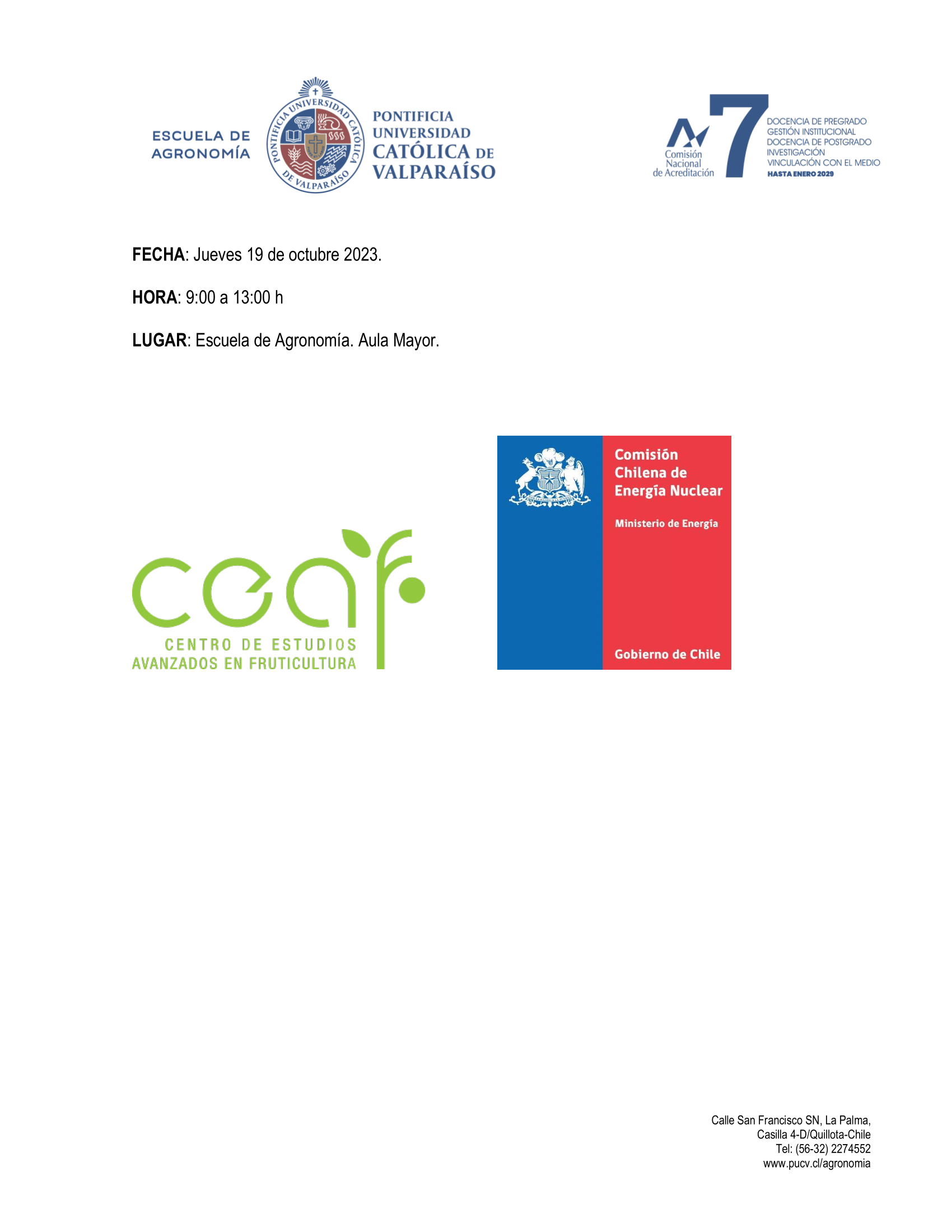 Lugar: Aula Mayor de la Escuela de Agronomía PUCV, Calle San Francisco s/n, La Palma, Quillota.