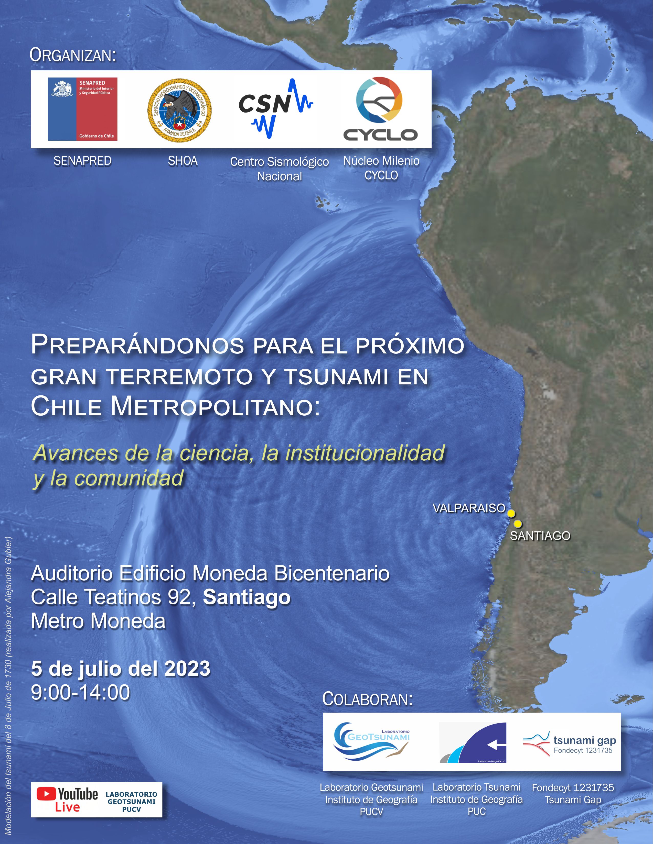 A partir de las 9.00 horas y hasta las 14.00 horas, la actividad se efectuará en el auditorio del Edificio Moneda Bicentenario (Calle Teatinos 92, a la altura de metro Moneda), es organizado por SENAPRED, SHOA, el Centro Sismológico Nacional y el proyecto Núcleo Milenio CYCLO, y el cual además contará con la colaboración del Laboratorio Tsunami del Instituto de Geografía UC y el Fondecyt 1231735 Tsunami Gap, sumado al Laboratorio Geotsunami, como ya se mencionó.