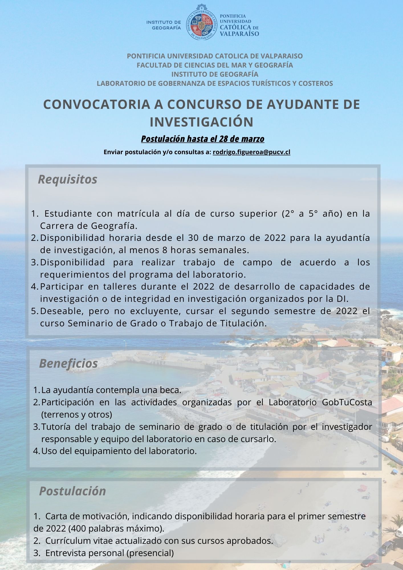 El Laboratorio de Gobernanza de Espacios Turísticos y Costeros (GobTuCosta) del Instituto de Geografía de la Pontificia Universidad Católica de Valparaíso, y a cargo de Rodrigo Figueroa Sterquel, les invita a participar del concurso para el cargo de Ayudante de Investigación.