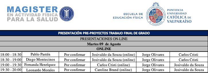 Usted está en: Portada | Magíster en Actividad Física para la Salud | Agenda Presentación de Pre-proyectos Grupo 3 Twittear subir volver