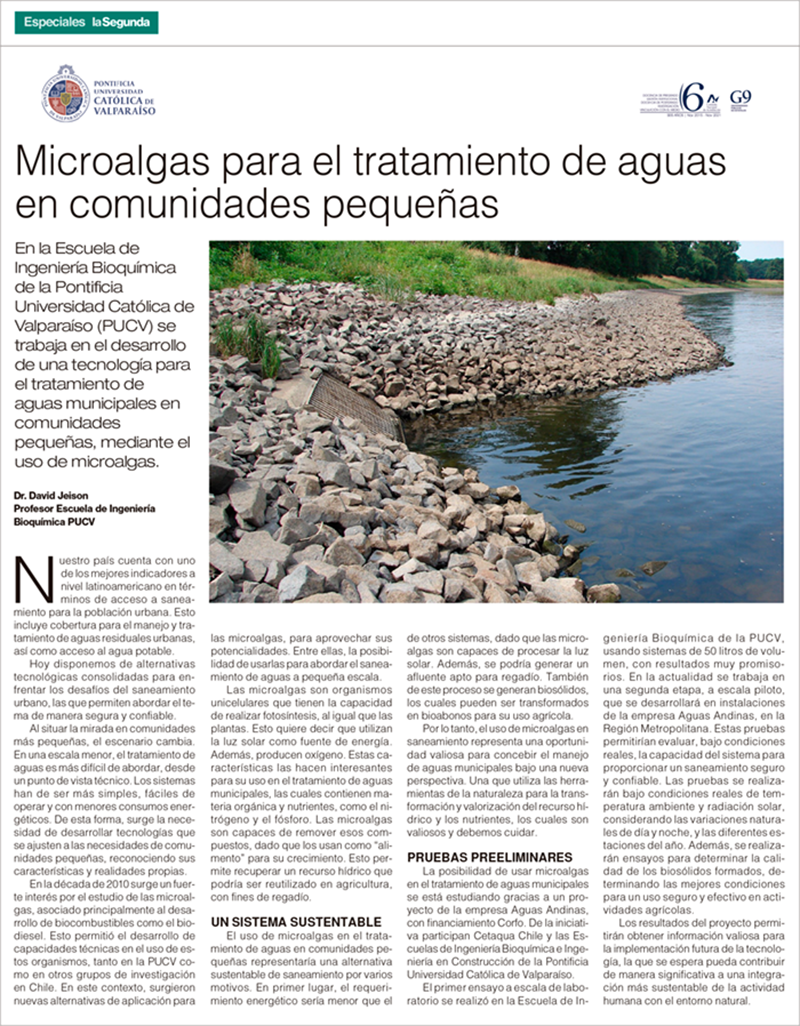 En la Escuela de Ingeniería Bioquímica de la Pontificia Universidad Católica de Valparaíso (PUCV) se trabaja en el desarrollo de una tecnología para el tratamiento de aguas municipales en comunidades pequeñas, mediante el uso de microalgas.