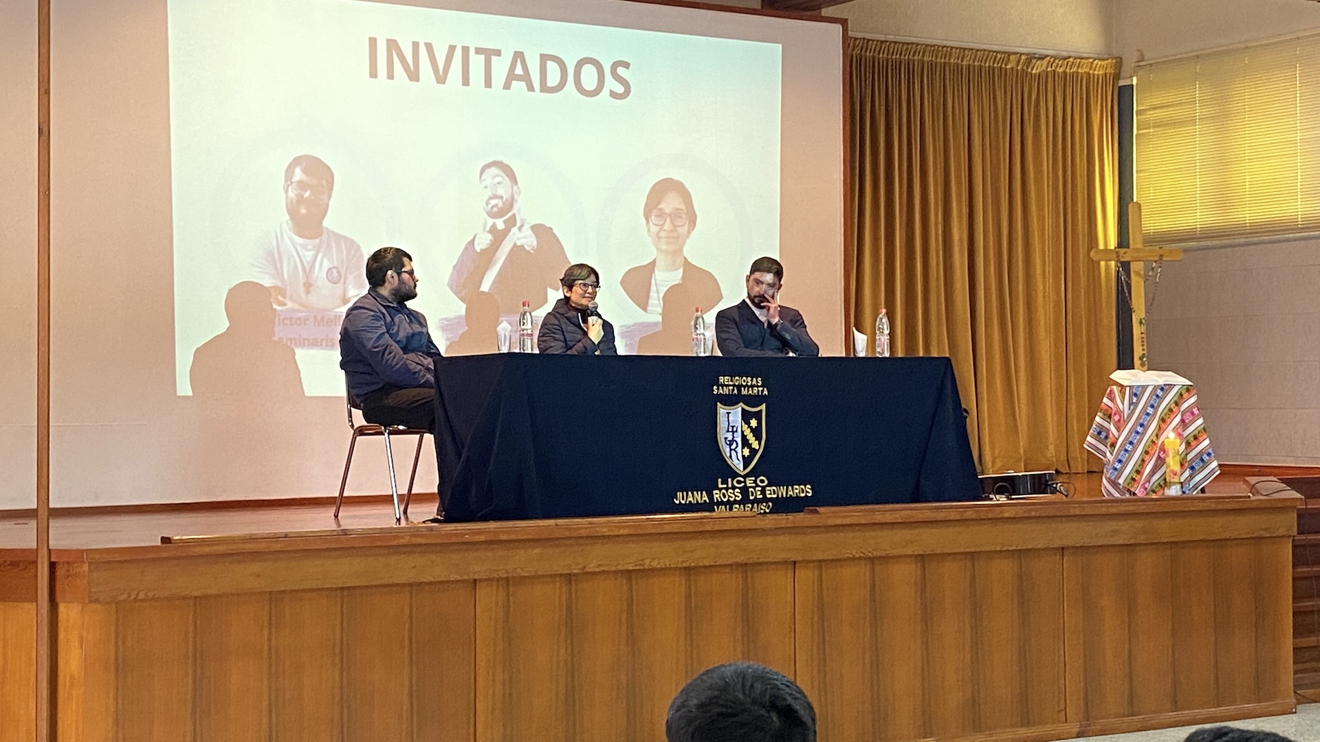 Víctor Mella, seminarista diocesano; Constanza Novoa, religiosa misionera colombiana, y el sacerdote José Pablo Valencia, Capellán General de la Pastoral PUCV conversaron con los y las jóvenes de tercero y cuarto medio del Liceo Juana Ross de Edwards.