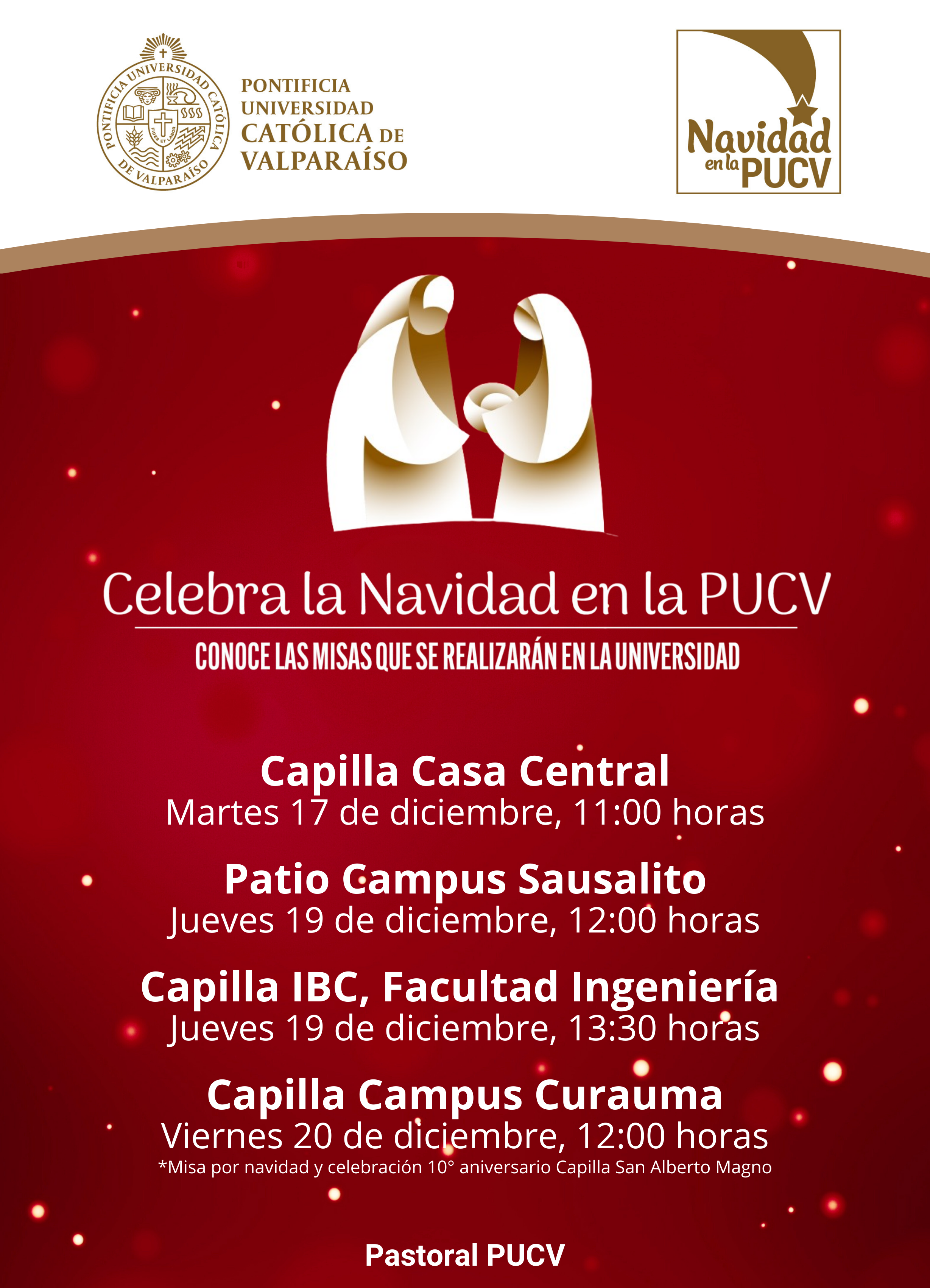 Las actividades organizadas por la Pastoral en el marco de la celebración de Navidad contemplan una eucaristía en la Capilla de Casa Central el martes 17, a las 11 horas, la que será presidida por el Obispo de Valparaíso y Gran Canciller PUCV, Monseñor Jorge Vega.