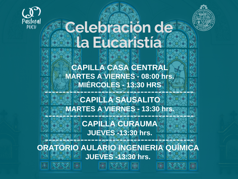 La Pastoral de la PUCV en su labor de "animar a participar en la celebración de los sacramentos, especialmente del sacramento de la Eucaristía, como el más perfecto acto del culto comunitario" (Ex Corde Ecclesiae, 39), invita a toda la comunidad universitaria a participar en las misas semanales que se ofrecerán en los siguientes lugares y horarios: