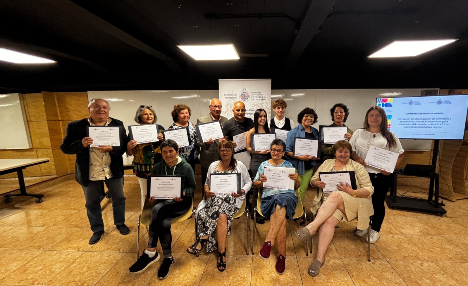 Con mucha alegría se realizó la ceremonia de cierre del Proyecto de Vinculación con el Medio: "Formación en Manipulación de Alimentos y Buenas Prácticas de Manufactura para voluntarios del comedor solidario 421 de acuerdo a la normativa vigente", iniciativa en conjunto con la Escuela de Alimentos y la Pastoral PUCV durante este 2025, en donde se capacitaron 16 voluntarios del comedor solidario de la Iglesia La Matriz.