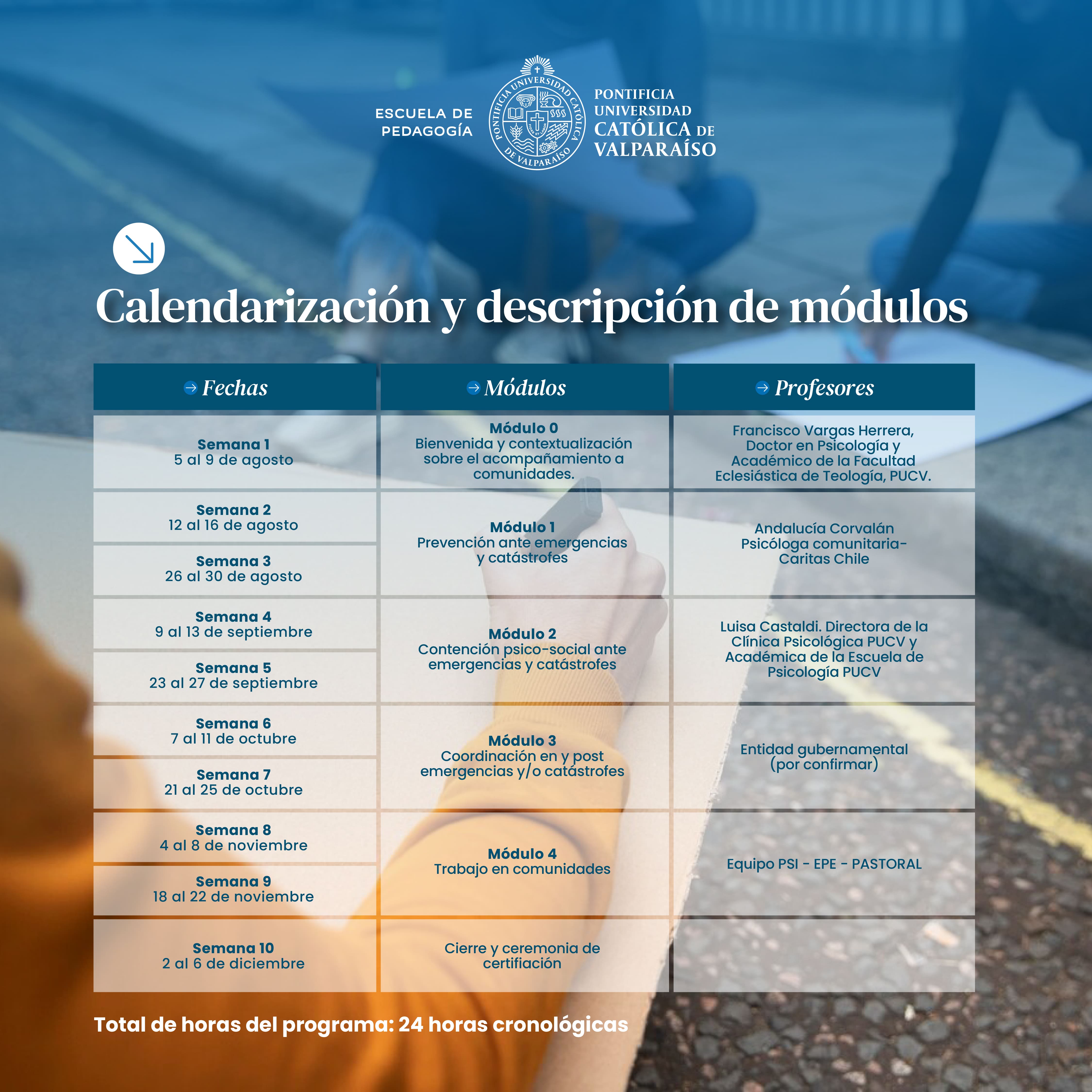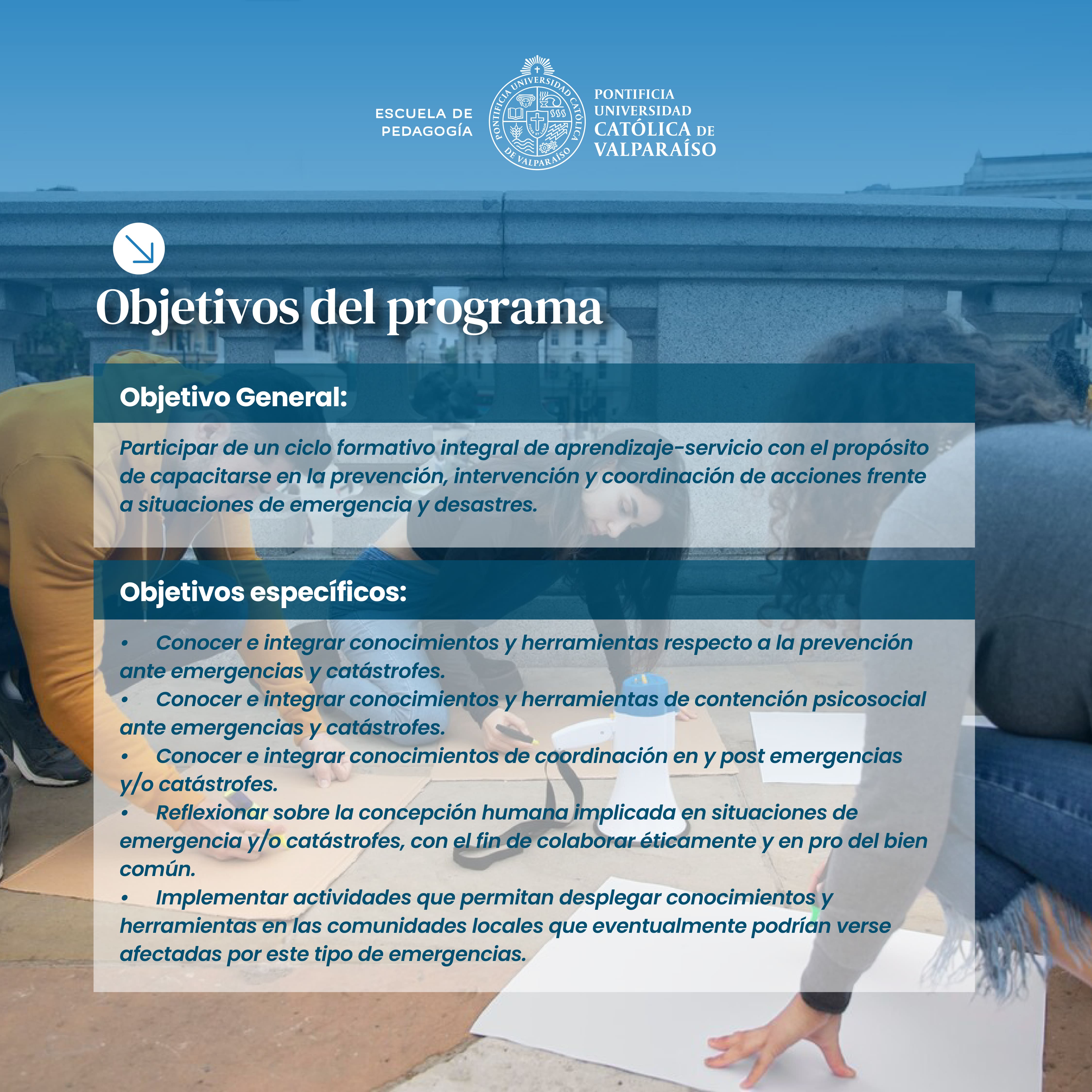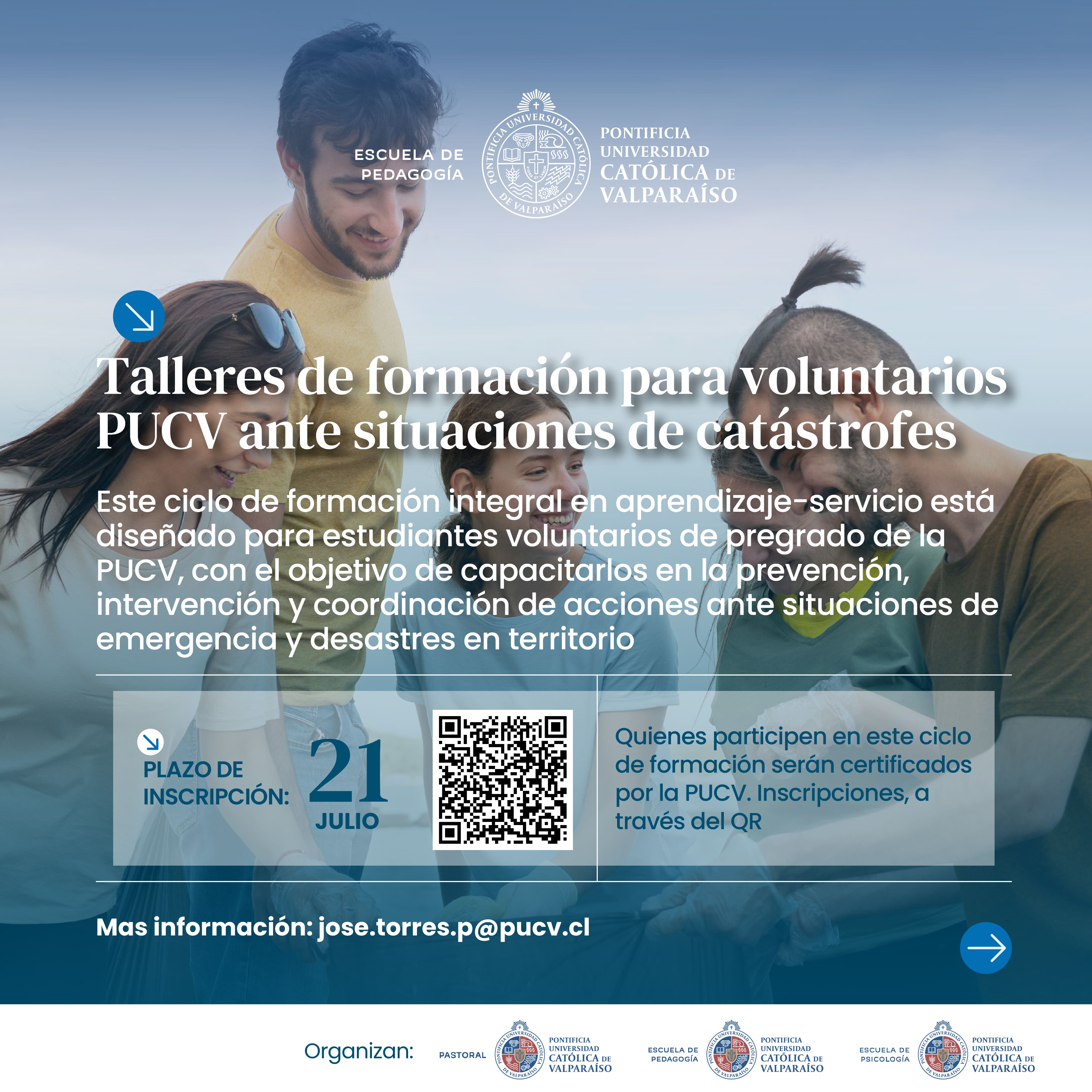 En el marco del proyecto de Vinculación con el Medio, en el que participan la Escuela de Pedagogía, la Escuela de Psicología y la Pastoral, te invitamos a formarte como voluntario/a ante situaciones de catástrofe. Al participar en esta formación de 5 módulos, recibirás una certificación por parte de nuestra universidad.