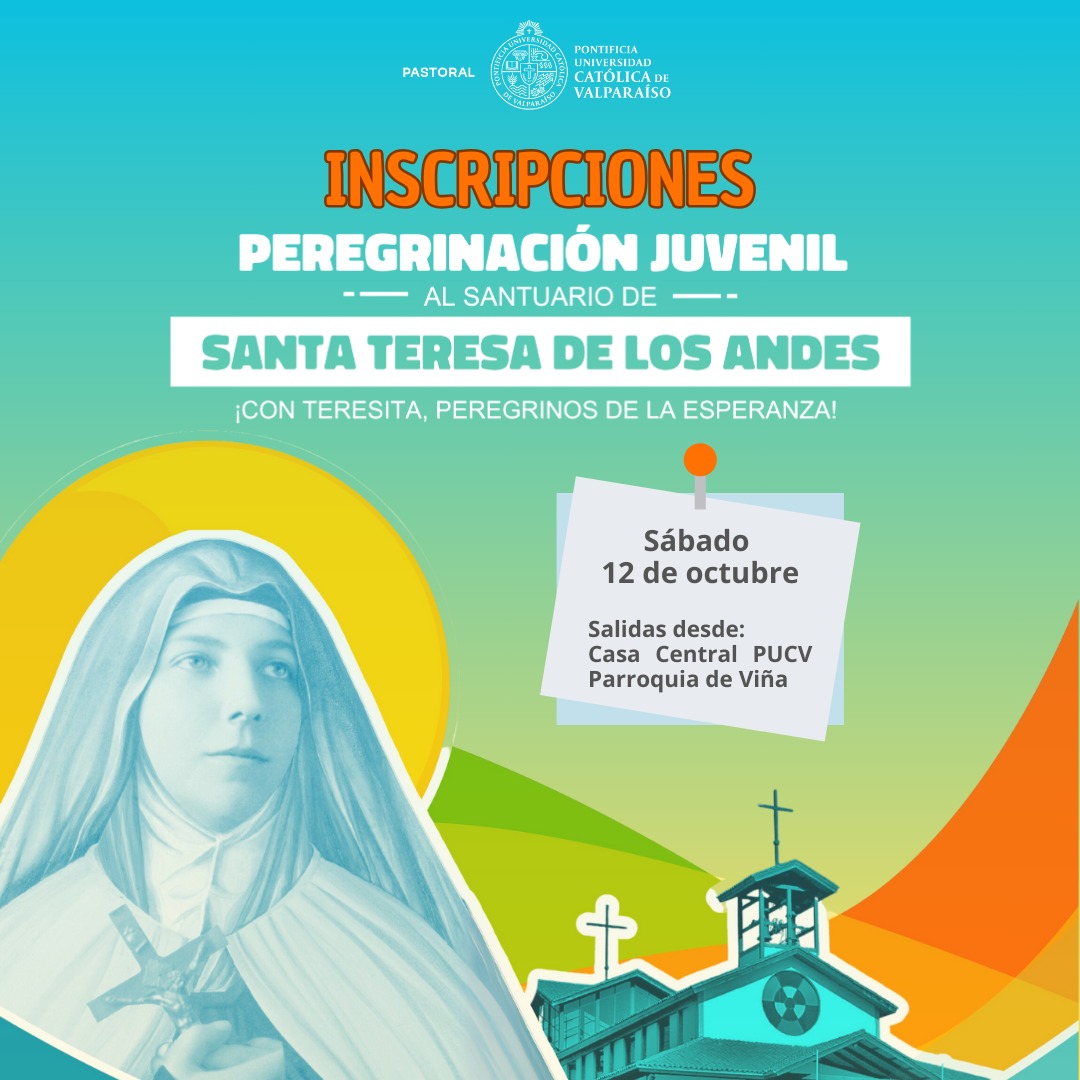 Te invitamos a peregrinar junto a la Pastoral PUCV al Santuario de Santa Teresa de Los Andes, que se realizará el día sábado 12 de octubre de 2024, desde Chacabuco al Carmelo. Son aproximadamente 27 kilómetros que se recorren caminando en compañía de miles de jóvenes de todo Chile. Esta invitación es abierta para académicos, funcionarios y estudiantes. Puedes inscribirte aquí: https://forms.gle/r8HHyejaAePk8eGfA