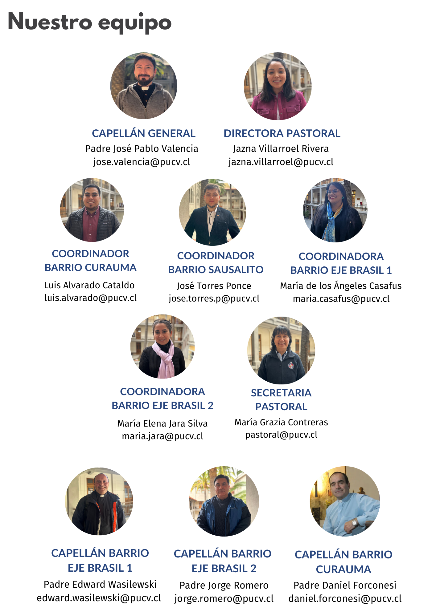 Representantes de la comunidad PUCV de manera sinodal, concordaron lo siguiente: La Pastoral PUCV, asumiendo la misión institucional en lo referido al cultivo - a la luz de la fe - de las ciencias, las artes, las técnicas, la formación de graduados y profesionales con vocación de servicio a la sociedad, busca evangelizar al estilo de Jesús, a través del fomento del diálogo entre fe-cultura. Para ello promueve la formación, la celebración de la fe, la vida eclesial, el acompañamiento y el servicio misionero, con la finalidad de anunciar el Reino de Dios en la universidad y la sociedad.