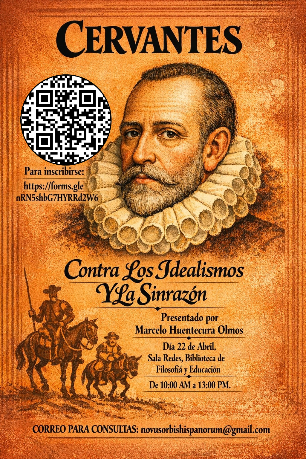 Con motivo del aniversario número cuatrocientos diez de la muerte de Cervantes, que se cumple el día veintidós de abril, se realizará esta presentación, en la cual se tratarán los siguientes temas, a saber: