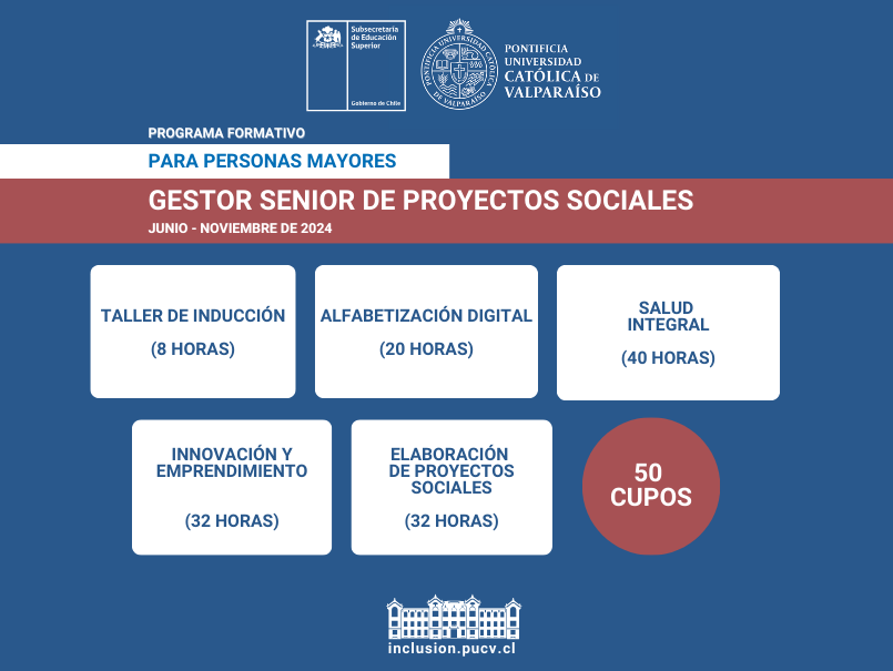 El plan formativo para personas mayores abarca en total 132 horas pedagógicas divididas en 5 cursos: Inducción a la PUCV, alfabetización digital, salud integral, innovación y emprendimiento, y elaboración de proyectos sociales. Las clases se impartirán dos veces cada semana de 09.30 a 12.15 horas, desde junio a noviembre de 2024. Hay 50 cupos disponibles.