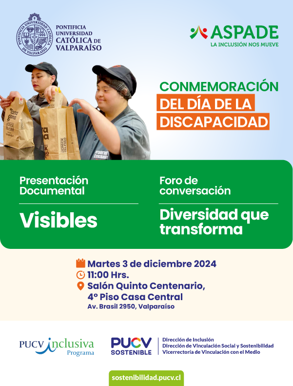 La Pontificia Universidad Católica de Valparaíso, por medio de la Vicerrectoría de Vinculación con el Medio y su Direcciones de Inclusión y de Vinculación Social y Sostenibilidad, en conjunto con ASPADE, llevarán a cabo una conmemoración del Día Internacional de la Discapacidad.