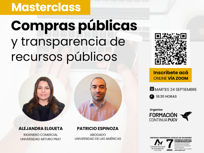 En el contexto del Diplomado en Compras Públicas, la Dirección de Formación Continua de la PUCV realizará la Masterclass “Compras públicas y transparencia de recursos públicos”, que se efectuará el martes 24 de septiembre a partir de las 18:30 horas.
