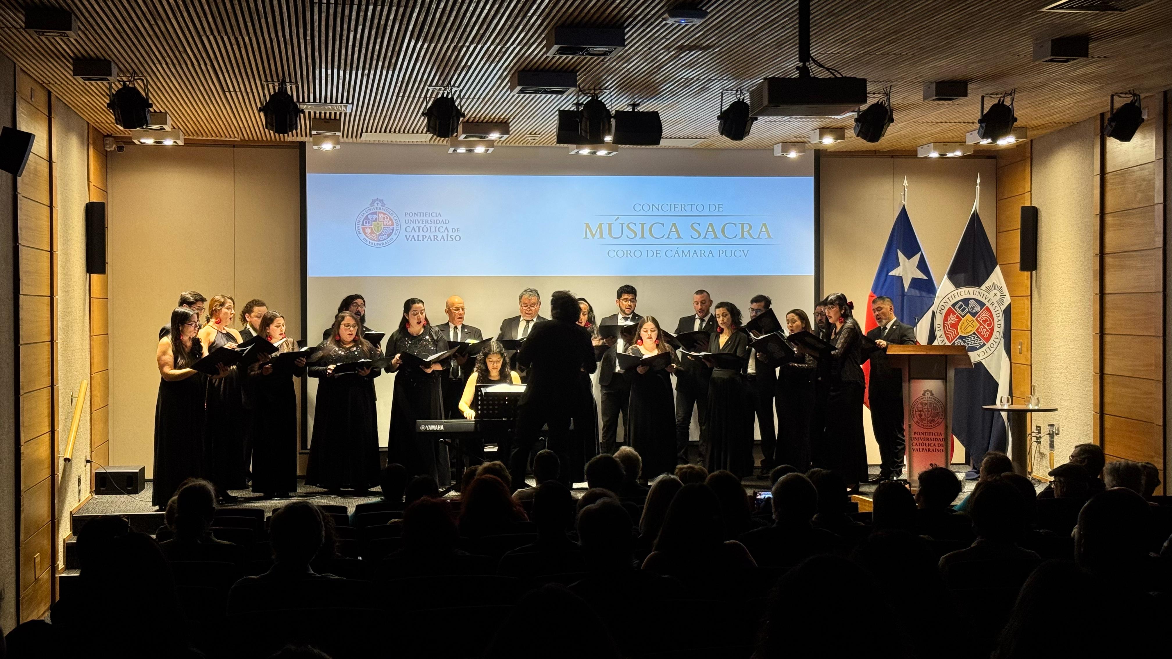 Un hermoso concierto de música sacra en el auditorio Fernando Rosas de PUCV Santiago. Con la presentación en el escenario del Coro de Cámara PUCV, bajo la dirección de Manuel Suazo, el conjunto interpretó un nutrido repertorio de música sacra, destacando a Mozart y a Gloria de Vivaldi, entre otros.