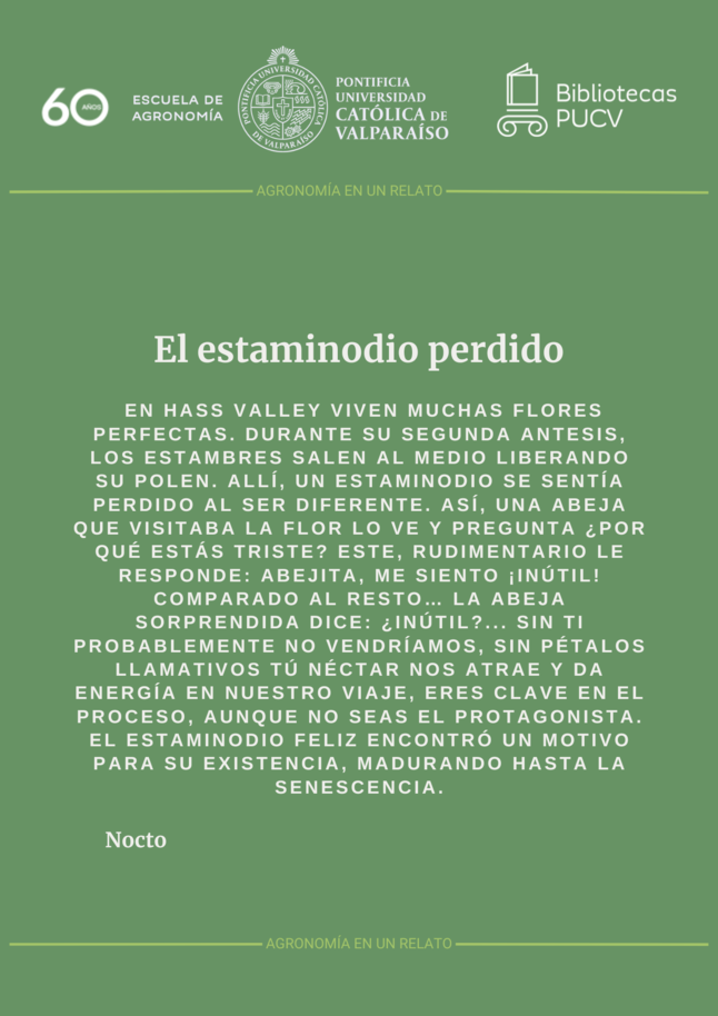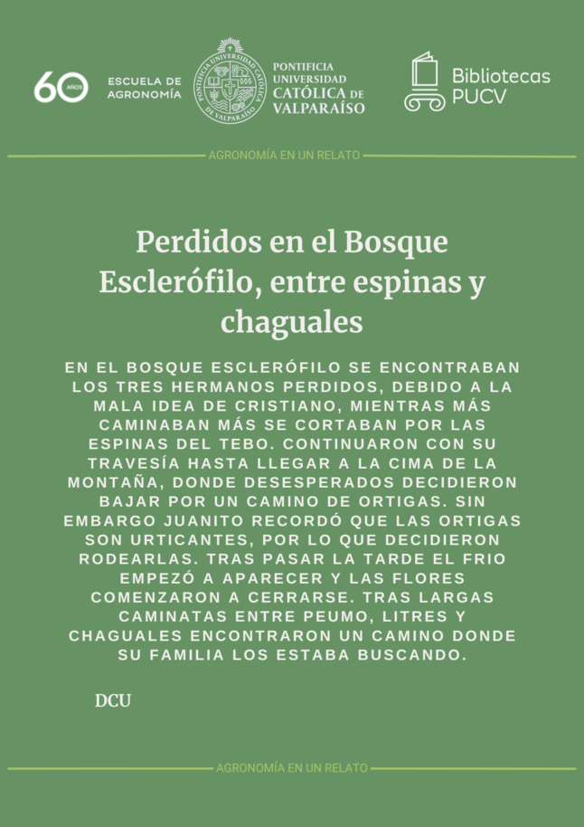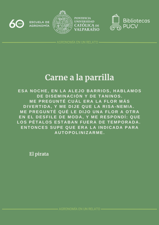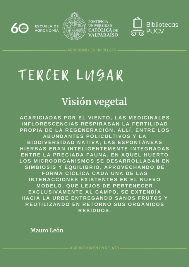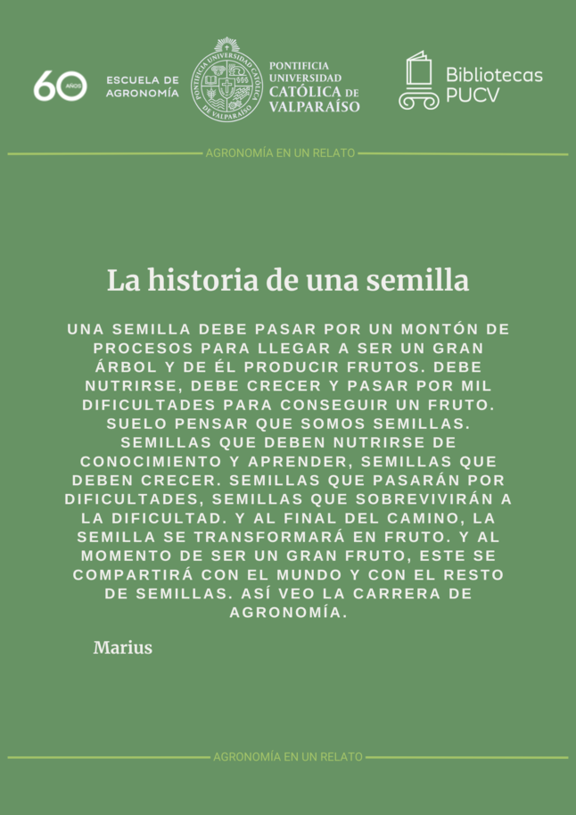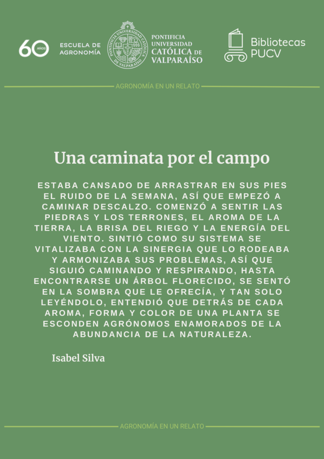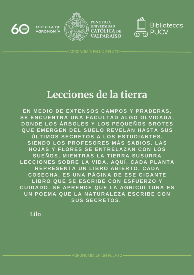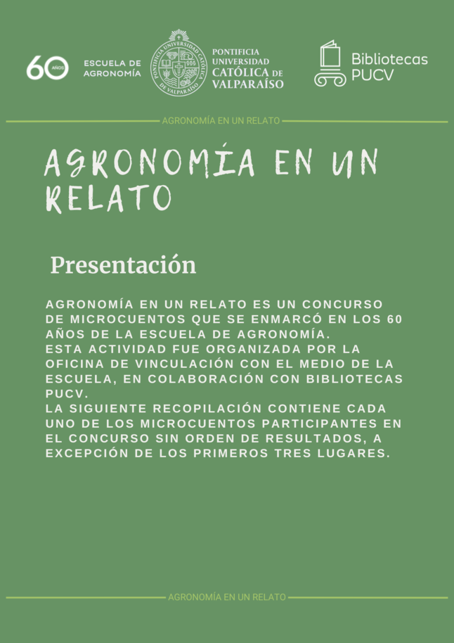 Agronomía en un relato es un concurso de microcuentos que se enmarcó en los 60 años de la escuela de agronomía.  Esta actividad fue organizada por la Oficina de Vinculación con el Medio de la Escuela, en colaboración con Bibliotecas PUCV.
