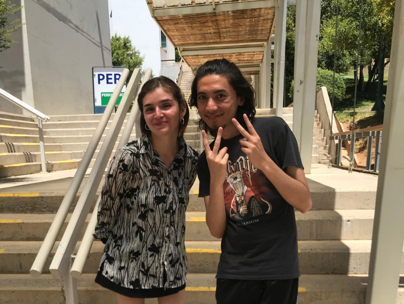 Descripción de imagen: Sara y Fabián, egresados de BETA, ahora docentes, posando en escaleras de campus Curauma, PUCV.
