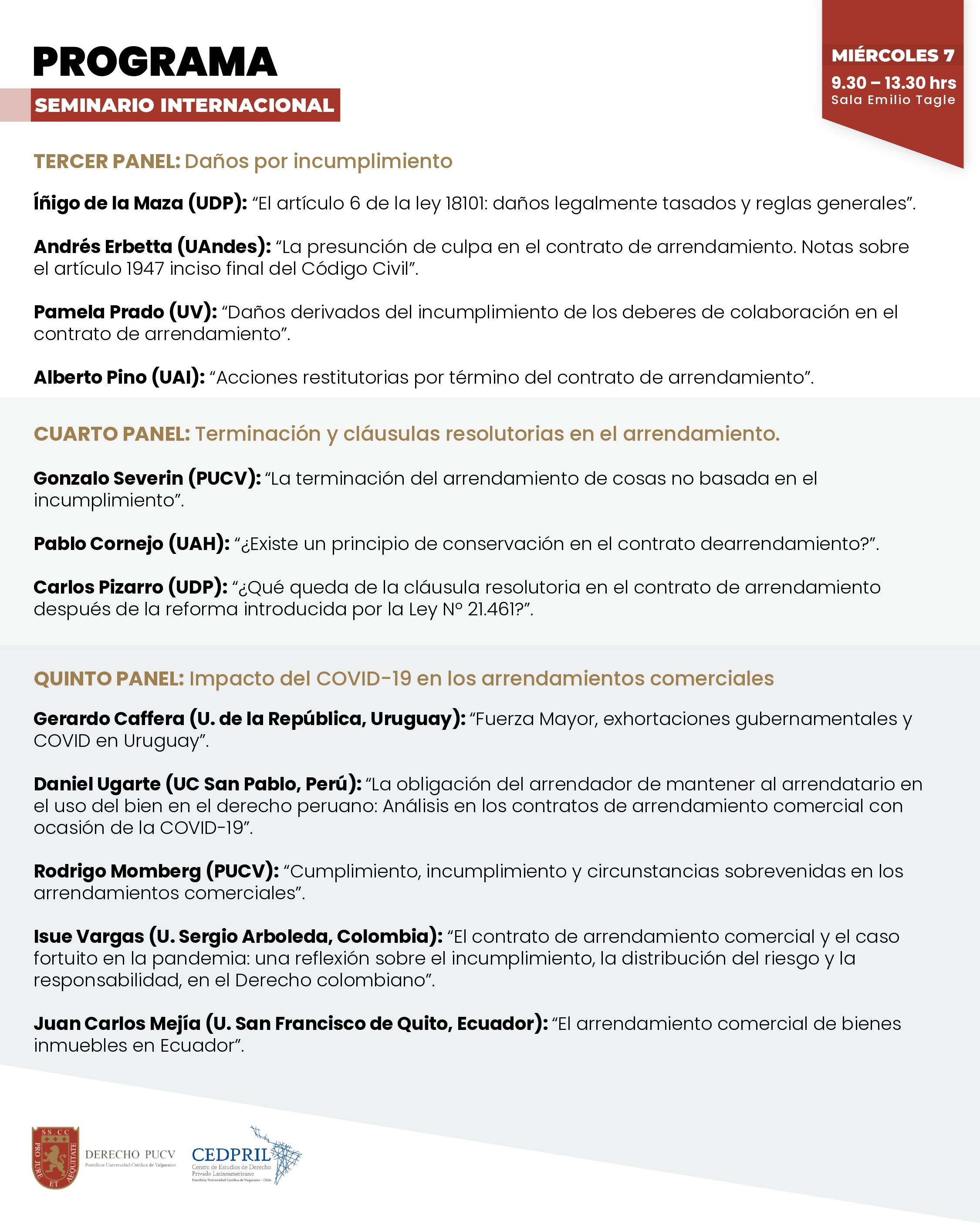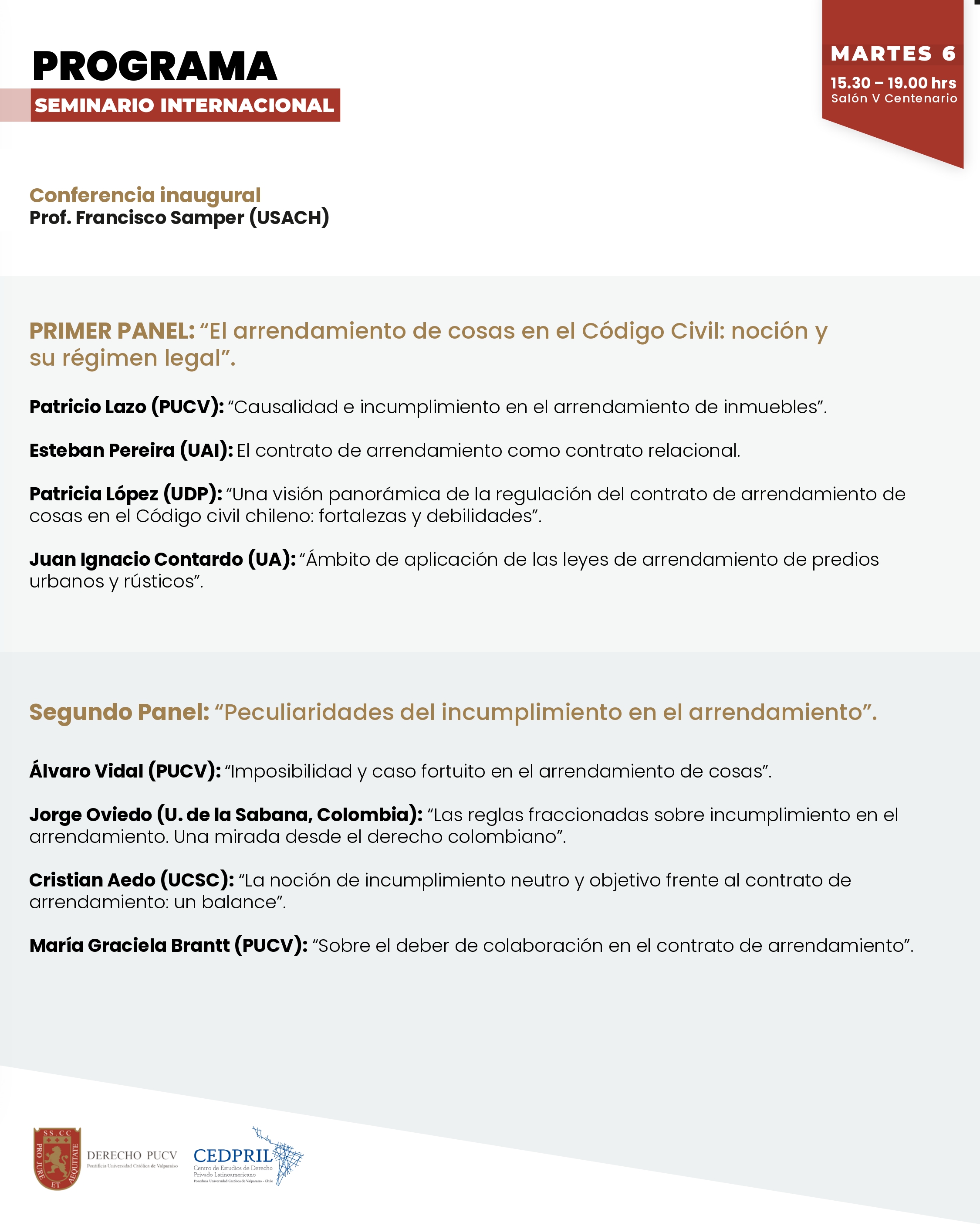 La Facultad y Escuela de Derecho de la Pontificia Universidad Católica de Valparaíso y el Centro de Estudios de Derecho Privado Latinoamericano (CEDPRIL) de la misma Casa de Estudios, desarrollarán en conjunto el seminario internacional titulado "Cuestiones en torno al contrato de arrendamiento".