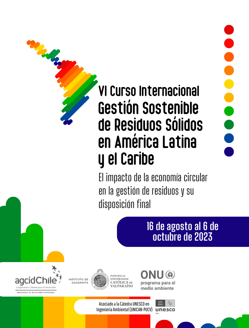 La VI versión del Curso Internacional en Gestión Sostenible de Residuos: El impacto de la economía circular en la gestión de residuos y su disposición final es financiada por la Agencia Chilena de Cooperación Internacional (AGCI), en colaboración con el Instituto de Geografíade la Pontificia Universidad Católica de Valparaíso (PUCV), así como el Programa de las Naciones Unidas para el Medio Ambiente (PNUMA), en asociación a la Cátedra Unesco en Ingeniería Ambiental (UNICAN-PUCV).
