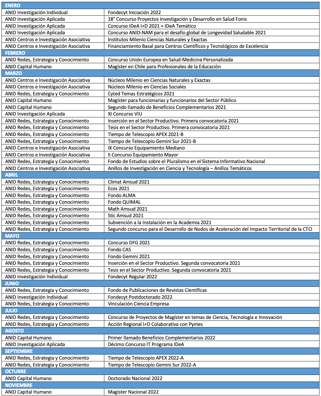 ANID entregó listado de sus convocatorias para el año 2021, junto a su correspondiente mes de apertura.