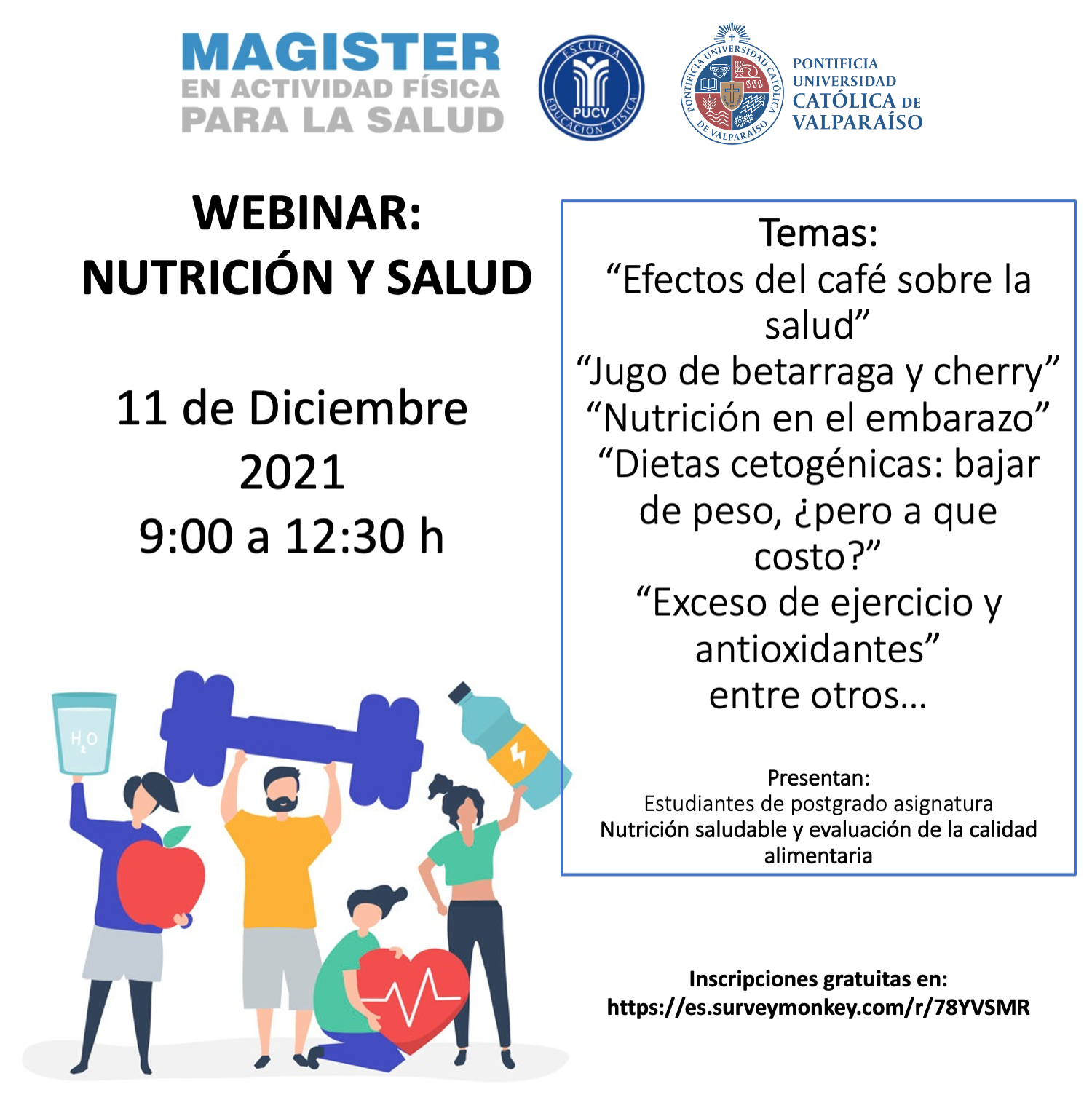 Se invita a toda la comunidad universitaria al “Webinar: Nutrición y Salud” que organiza el programa de Magíster en Actividad Física de la Salud, el cual es parte de la Escuela de Educación Física de la Pontificia Universidad Católica de Valparaíso.